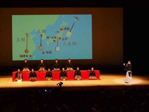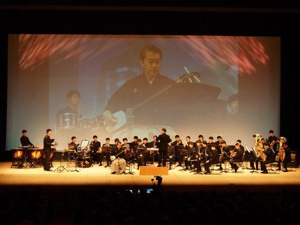 長唄三味線の芳村伊十冶郎さんの母校であり、伊十冶郎さんは吹奏楽部で活躍していたそうです。当時からご縁のある先生よりご本人に「伝統芸能で芸術鑑賞教室を行いたい」旨のお話があり、その制作をお引き受けした次第です。