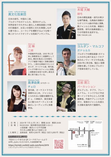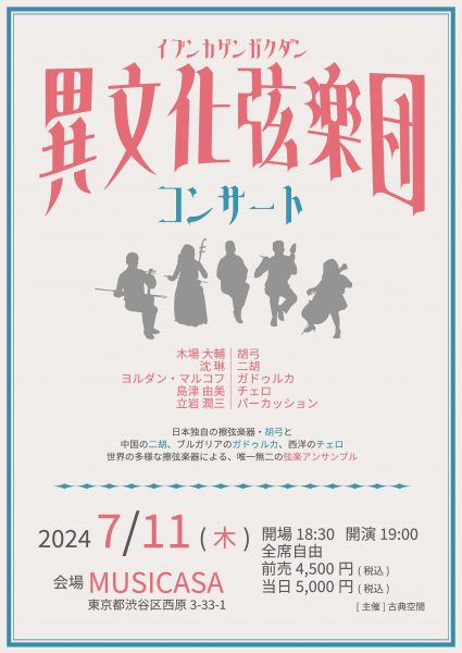 異文化弦楽団 コンサート 会 場: MUSICASA(東京都渋谷区西原3-33-1 ) 日 時:2024年7月11日(木) 開場18:30 開演19:00 料 金: 全席自由 前売4,500円(税込) 当日5,000円(税込) 予 約:予約フォーム 主 催: 有限会社 古典空間 お問合せ: 有限会社 古典空間 TEL 03-5478-8265(平日10~18時)