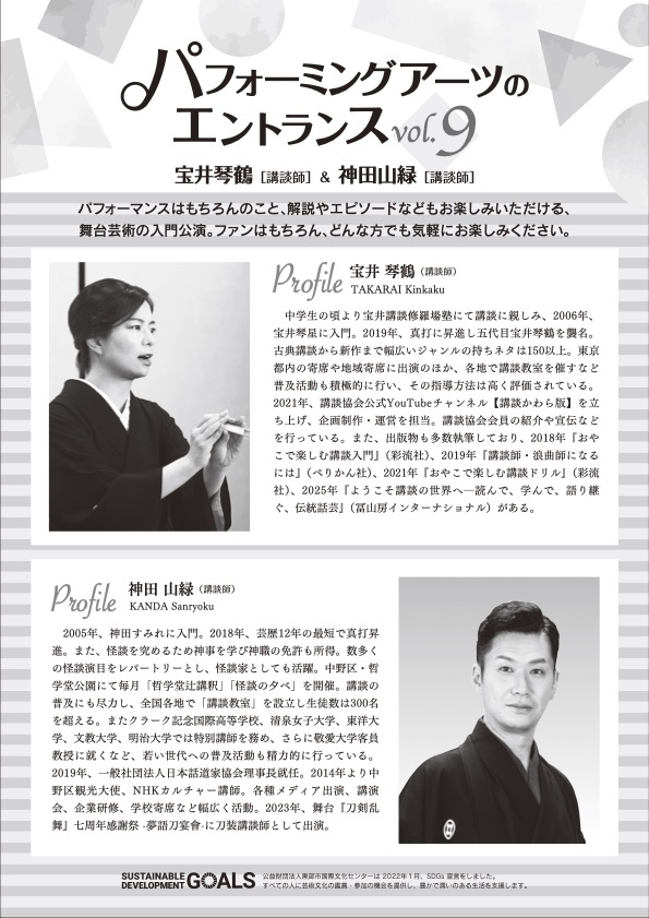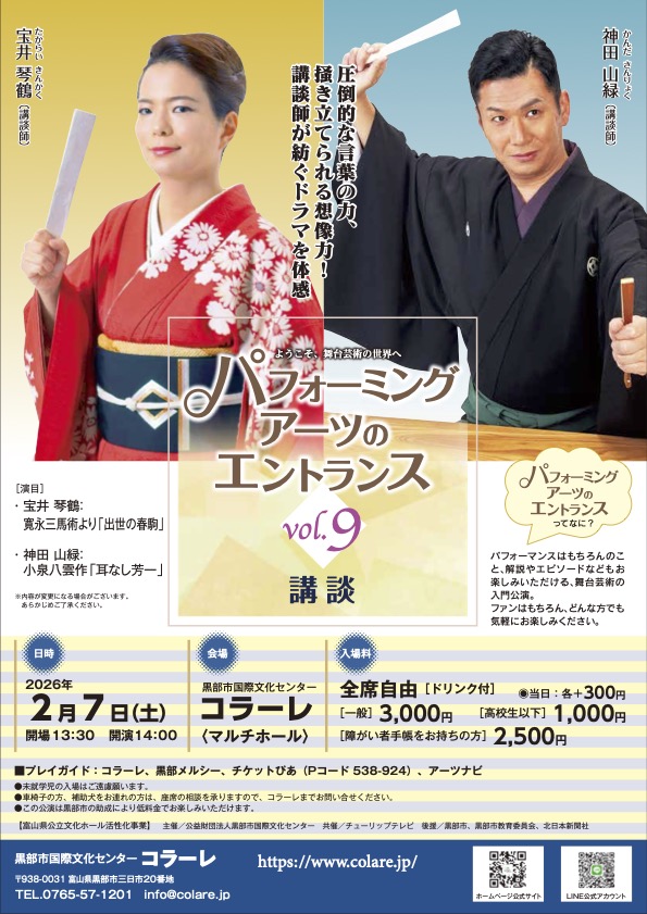コラーレが届け続ける定番シリーズ「パフォーミングアーツのエントランス」。普段馴染みのない、またナマで観聴きする機会の少ない芸能や音楽などを、ジャンルを問わず幅広く伝え続けてきた地域の皆さまにはお馴染みの企画です。 2023年には、木場大輔さんの胡弓と日原暢子さんの箏・二十五絃箏による演奏を、黒部市内の小中学校と、コラーレのマルチホールにおける“サロンコンサート”風な演奏会を通してお届けしました。 今回は2年ぶりになりますが、「講談」をご紹介します。宝井琴鶴さんは「出世の春駒」という武士の世界を描いた講談ならではの演目、神田山緑さんはお得意の怪談より「耳なし芳一」(小泉八雲作)…お二人の対談と共にお楽しみいただきます。